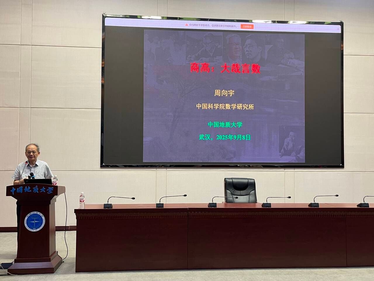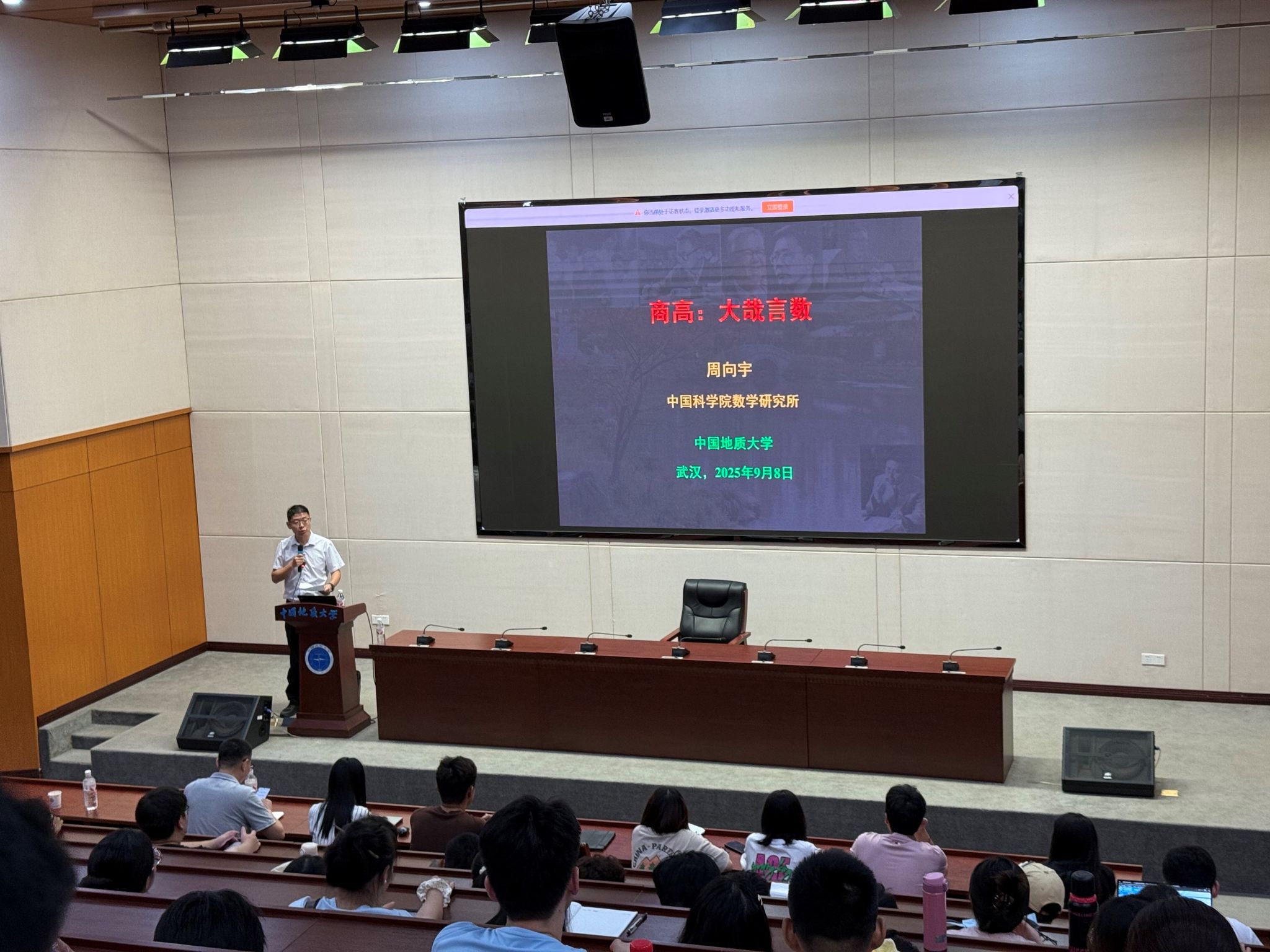 2025年9月8日,应十大买球的正规网站院长魏周超教授的邀请,中国科学院院士、发展中国家科学院院士、中国科学院数学与系统科学研究院周向宇研究员做客中国地质大学(武汉)“名家论坛”,在南望山校区东区教学综合楼A0116会议室为十大买球官网师生带来了一场题为“商高——大哉言数”的精彩学术报告。本次报告会由十大买球官网魏周超教授主持。2025级研究生、本科生百余人参加此次报告。