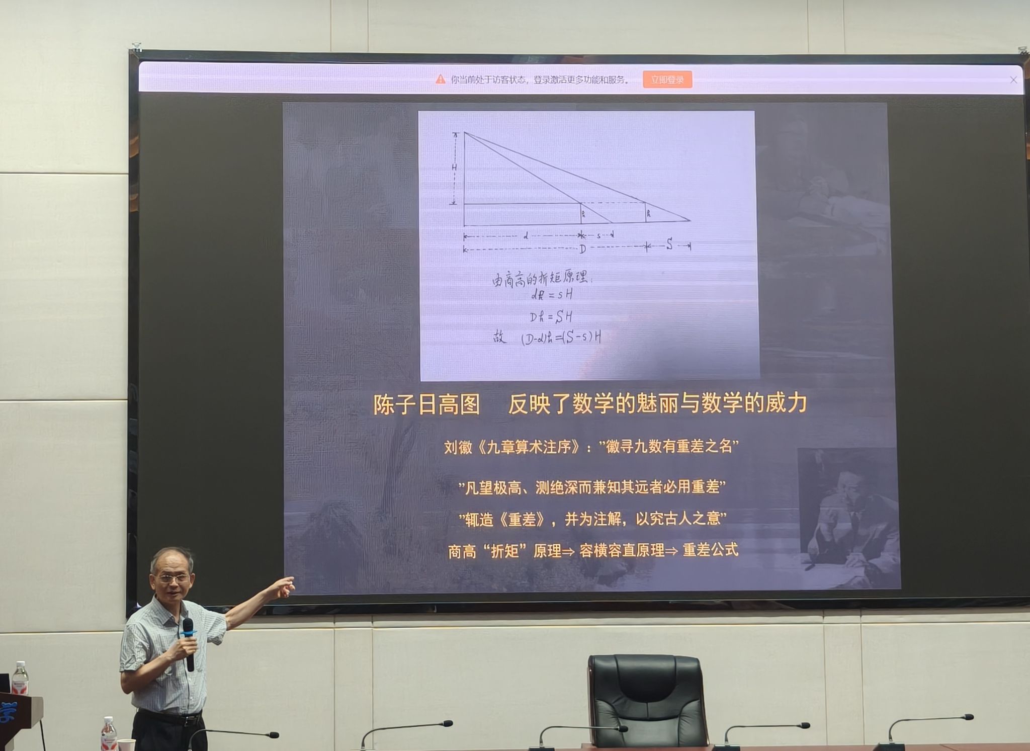 讲座尾声,周院士简要介绍了古代数学在多个现代数学分支中的影响与贡献,鼓励在场师生学习我国先贤的钻研求索精神,同时也简单介绍了其团队在多复变函数论领域取得的最新研究进展,以及在复代数几何、复微分几何等相关领域产生的应用价值与学术影响,指出与商高等古圣先贤思想也可互相印证,让师生们对中国古代数学中所蕴含的独特智慧、以及和前沿数学研究的联系有了更为直观的认识。