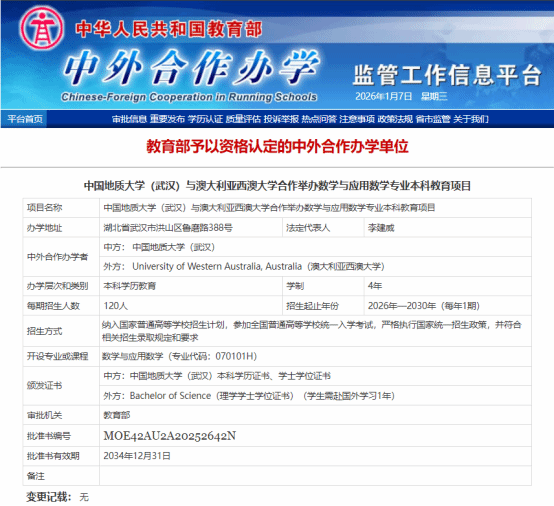 学校党委始终将国际化办学作为重要发展战略,高度重视对外教育合作交流。2025年3月起,十大买球的正规网站在国际合作处、本科生院、校办公室法规办,财务与资产管理部等职能部门的大力指导和支持下,组建专业专家团队系统谋划、周密组织,召开多轮内外专题研讨,并远赴澳大利亚,对西澳大学开展实地考察与深度交流,为合作项目的顺利推进筑牢基础。在学校领导的统筹部署与悉心指导下,在历经多轮磋商谈判、材料打磨与申报筹备,成功攻克各项难点,推动项目顺利通过教育部审批。该项目的落地,将搭建起中澳数学学科领域人才联合培养、学术科研协同创新、教学实践互鉴的优质平台。同时,依托这一合作纽带,还将推动两校在地质学、地质资源与地质工程等优势学科领域的深度交叉融合,为拓展更广泛的学术合作与人才联合培养空间奠定坚实基础。