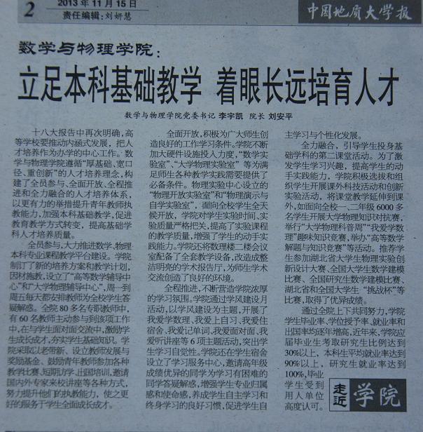 在2013年11月15日第451期的中国地质大学报的“走近学院”专栏中,刊登了一篇题为“十大买球的正规网站:立足本科基础教学 着眼长远培育人才”的专题报道,现把详细内容转载如下。