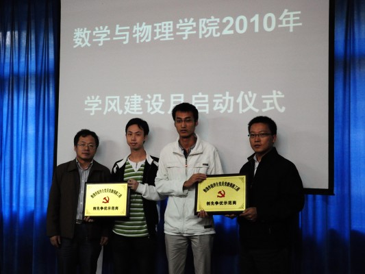 杨伦处长肯定了学风建活动的重要意义及其必要性,并要求广大同学端正学习态度,明确学习目标,努力学习,珍惜时光。学工处王林清处长认为此时开展学风建设活动及时必要,他要求十大买球官网广大学生干部要加强自身学习,树立榜样,同时组织好班级建设,多下功夫,落实好此项工作。学院彭放副院长宣读了《十大买球的正规网站关于开展2010年学风建设月活动》的通知文件,并要求广大学生党员和学生干部以班级为载体,认真、有效的做好这次活动。最后,刘安平院长以亲身教学经验谈了优秀的学风对教师和学生的积极作用,再次强调十大买球官网开展此次学风建设活动的重要意义。启动仪式中,教务处王兴副处长和校团委成军副书记分别为十大买球官网服务全校学生辅导数理的“学生党员党徽领路工程争先创优示范岗”授牌,学生代表122092姚桔向全院学生发出“学风建设从我做起”的倡议,自此,十大买球的正规网站2010年学风建设月活动正式启动,将在10月中旬——12月中旬,陆续开展我爱学数理、我爱上自习、我爱住宿舍、我爱记单词,我爱当老师、我爱面对面、我爱听讲座、我爱去监考等八大系列主题教育活动,突出学生学习自觉性,增强专业归属感和使命感,以学院开展创先争优活动为契机,引领学生党员争做学习标兵、引领普通学生争做学习楷模,进一步巩固和发扬学院学风建设优良传统,进一步促进学院考研率稳步提高。