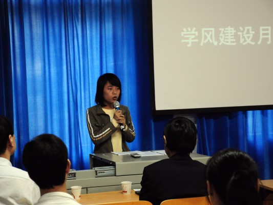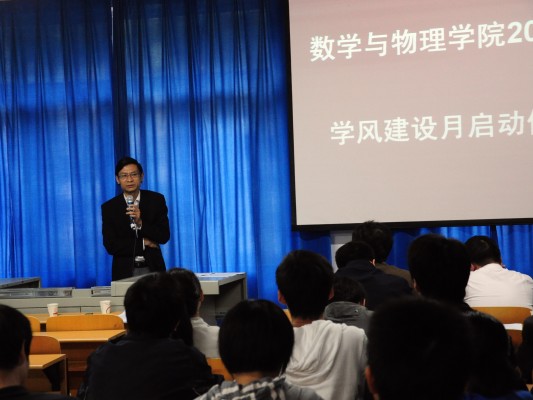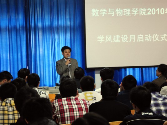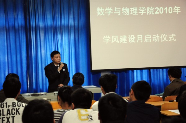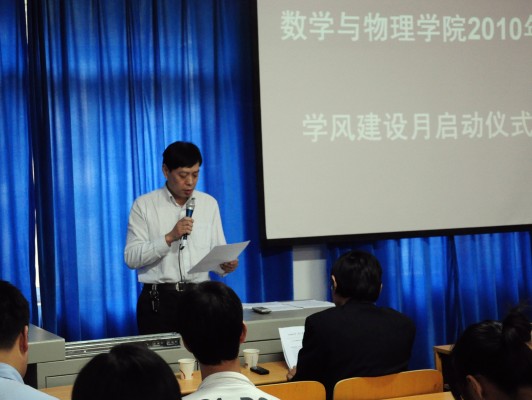 10月20日,十大买球的正规网站2010年“学风建设月”启动仪式在数理楼二楼会议室成功举行。教务处杨伦处长、学工处王林清处长,教务处王兴副处长,校团委成军副书记,学院刘安平院长,彭放副院长、以及学院各教研室主任应邀出席此次活动。院党委副书记李杰主持会议。