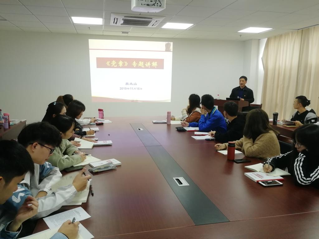 11月16日下午,十大买球的正规网站第66期入党积极分子培训班第二讲在东区教学综合楼A1505会议室举行。本次党课由学院党委书记吴太山讲授《党章》专题。院学生党建办主任孙宇涛主持。