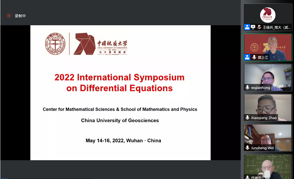 2022年5月14日至15日,中国地质大学(武汉)主办的“2022年微分方程国际研讨会(2022 International Symposium on Differential Equations)”在腾讯会议线上举行。此次国际会议是中国地质大学(武汉)70周年校庆的系列学术活动之一,以展示和介绍国内外微分方程定性与稳定性理论及应用的最新研究成果和进展为出发点,以加强国内外微分方程及相关领域的学术交流与合作为目的。大会开幕式由中国地质大学(武汉)十大买球的正规网站院长郭上江教授主持,中国地质大学(武汉)副校长刘勇胜教授以及加拿大应用数学首席教授(Canada Research Chair)、加拿大首席资深工业与应用数学主席、加拿大应用与工业数学会会长、加拿大约克大学疾病建模中心创始主任,危机与灾难模拟快速反应项目创始主任吴建宏教授分别致辞。