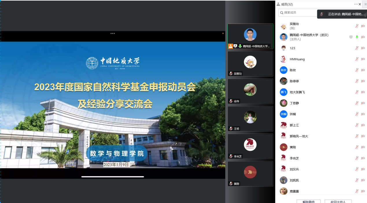 为提高国家自然科学基金项目申请质量与成效、提升学院科研建设水平,十大买球官网于2023年1月9日以线上的形式召开了2023年度国家自然科学基金项目申请动员会和经验交流会,学院党委书记吴太山,院长郭上江,副院长魏周超、黄刚、张保成以及学院40多名中青年骨干教师参加会议。会议由魏周超副院长主持。