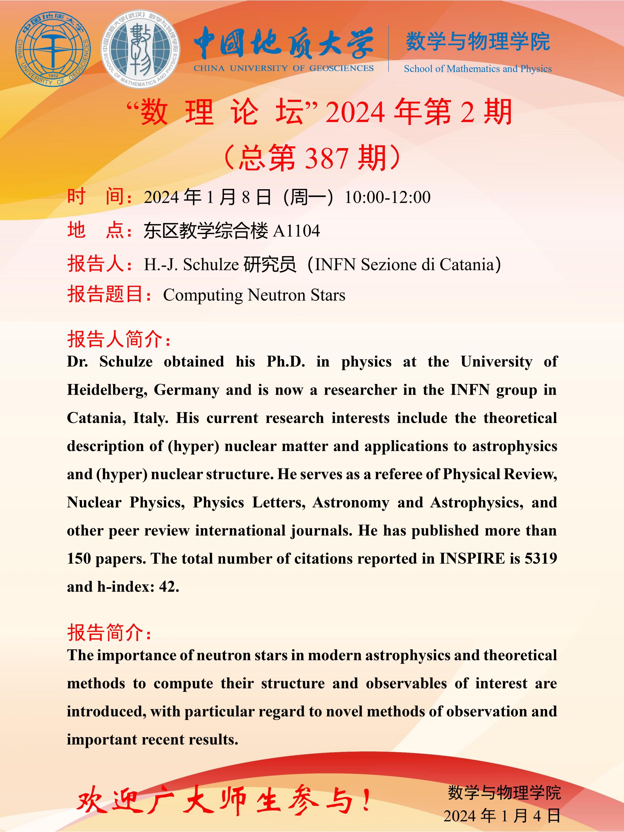 2024年1月8日H.-J. Schulze研究员学术讲座:Computing Neutron Stars