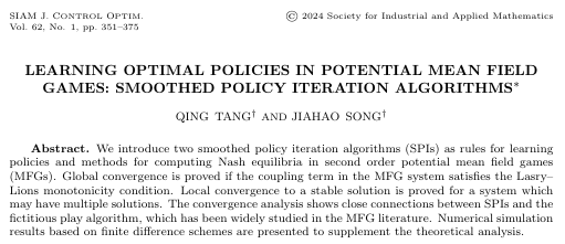 十大买球官网信息与计算科学系教师汤庆博士为第一作者的学术研究工作 “Learning Optimal Policies in Potential Mean Field Games: Smoothed Policy Iteration Algorithms” ,最近发表在国际著名期刊SIAM Journal on Control and Optimization。该论文第二作者为十大买球官网2020 级应用统计专业硕士生宋家豪。汤庆博士自2015年入职十大买球官网,主要从事动态博弈相关的偏微分方程理论、数值计算及在经济模型中的应用研究。
