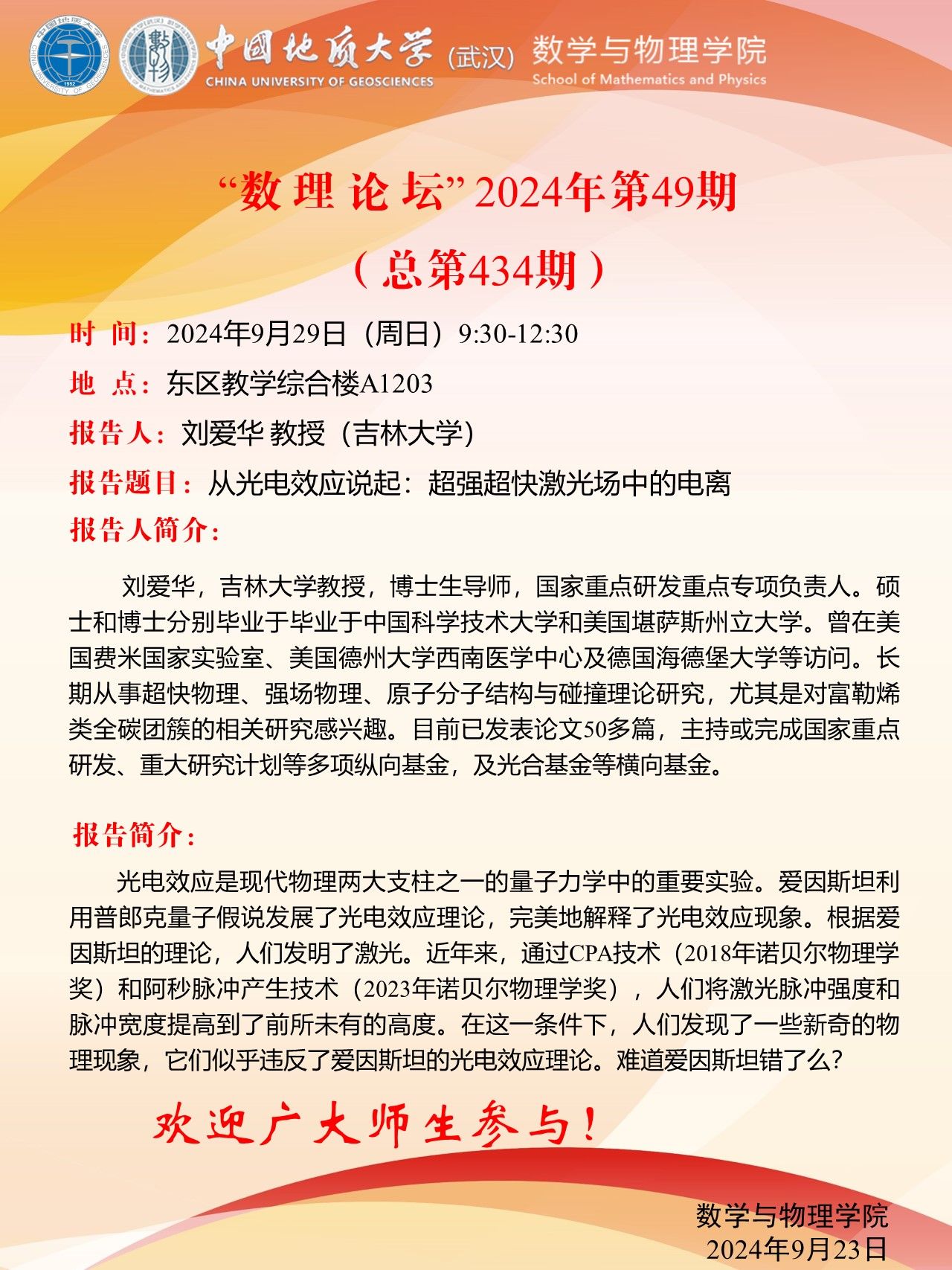 2024年9月29日刘爱华教授学术讲座:从光电效应说起:超强超快激光场中的电离