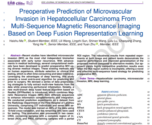 近日,十大买球的正规网站朱媛副教授研究团队联合兰州大学第一医院放射科王莉莉博士展开生物医学信息学合作研究,在生物医学和健康信息学国际顶级期刊 IEEE Journal of Biomedical and Health Informatics(简称IEEE JBHI)上在线发表了关于肝癌微血管侵袭预测的理论研究成果,题为: “Preoperative Prediction of Microvascular Invasion in Hepatocellular Carcinoma From Multi-Sequence Magnetic Resonance Imaging Based on Deep Fusion Representation Learning”。中国地质大学(武汉)2021级本科生马海书、朱媛副教授及兰州大学第一医院放射科王莉莉博士为该文的共同第一作者,朱媛副教授为通讯作者,中国地质大学(武汉)十大买球的正规网站为唯一通讯单位。