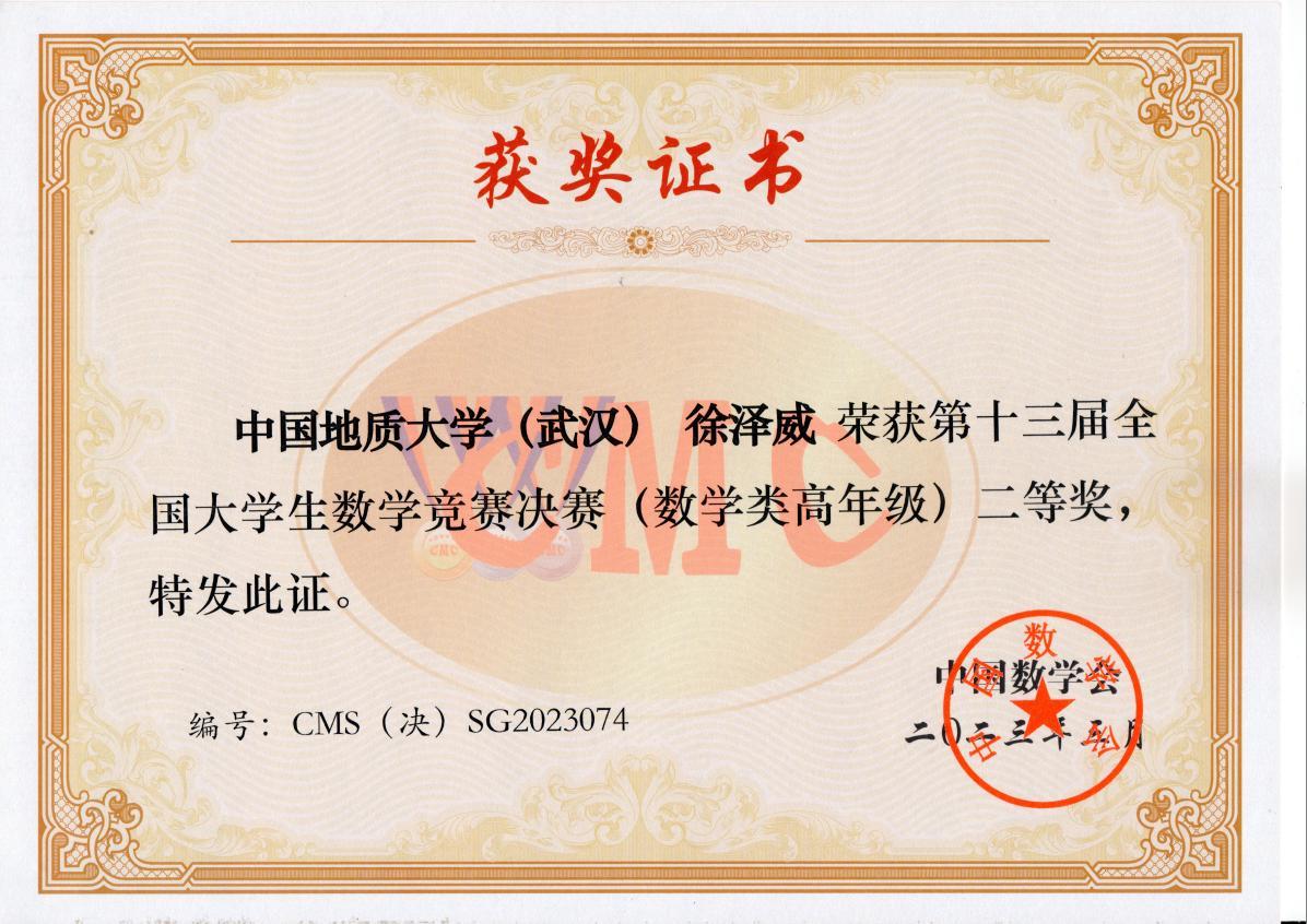 3月24日—26日,由中国数学会主办,华东师范大学承办的第十三届全国大学生数学竞赛决赛举行,十大买球官网徐泽威同学获得数学专业组(高年级)二等奖。