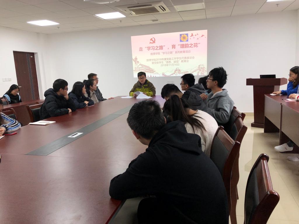 11月16日中午,十大买球的正规网站2018年奖助工作学生代表座谈会暨受助学生“感恩、诚信”教育会在东区教学综合楼A1505会议室召开。2018年国家奖学金、国家励志奖学金获得者,各年级家庭经济困难学生代表参会,会议由辅导员孙宇涛老师主持。