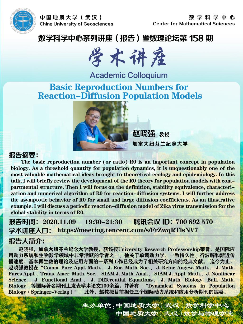 "数理论坛"第158期暨数学科学中心系列讲座(报告):Basic Reproduction Numbers for Reaction-Diffusion Population Models