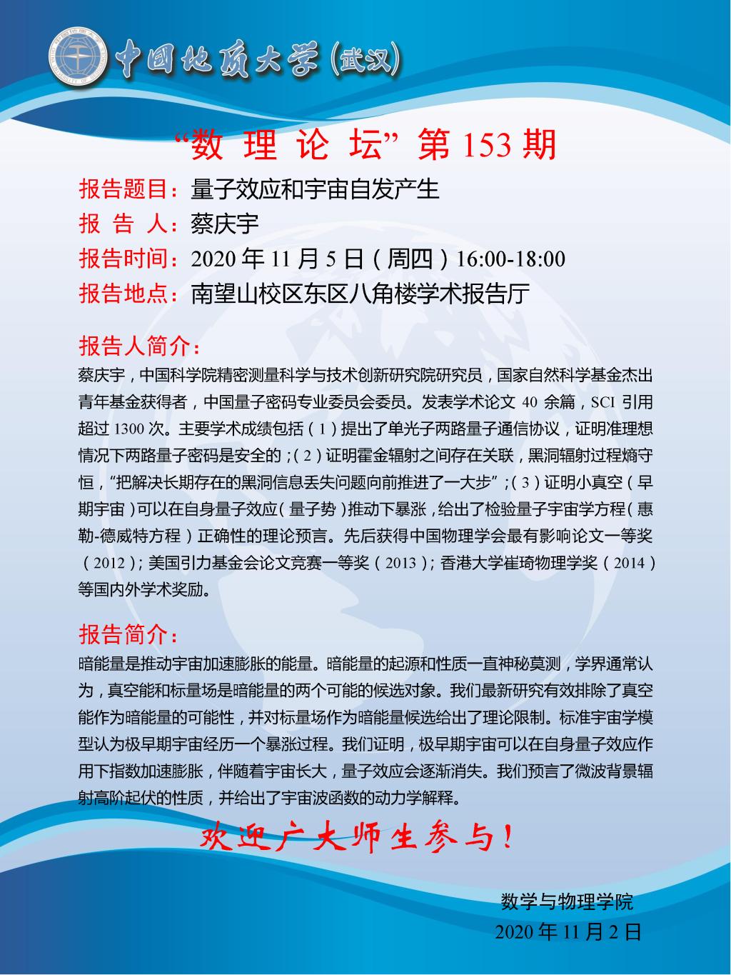 "数理论坛"第153期暨学校名家论坛第16期:量子效应和宇宙自发产生