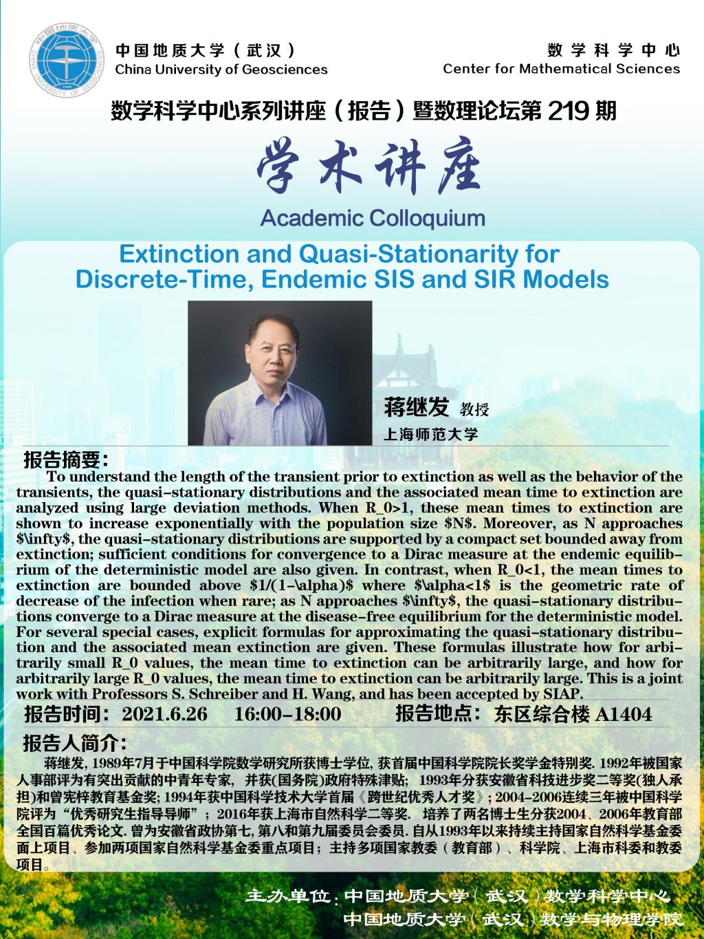 "数理论坛"第219期暨数学科学中心系列讲座(报告):Extinction and Quasi-Stationarity for Discrete-Time, Endemic SIS and SIR Models