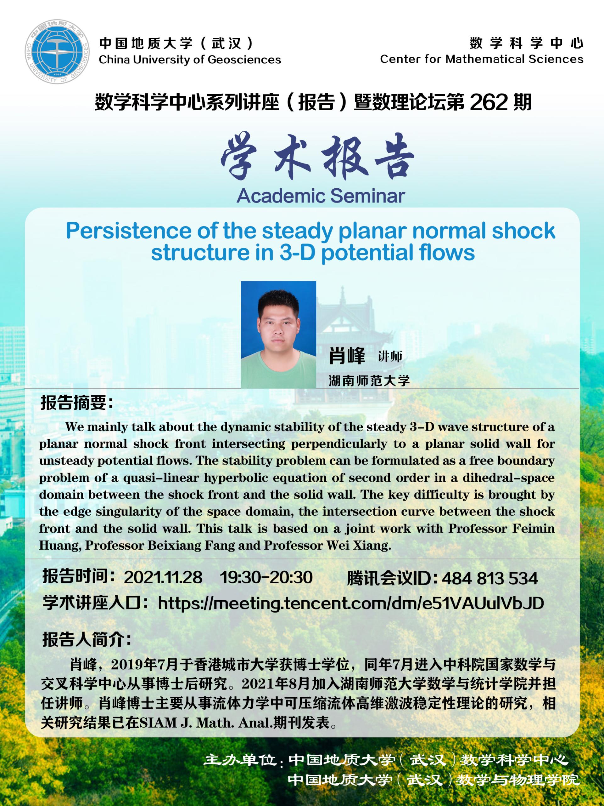 "数理论坛"第262期暨数学科学中心系列讲座(报告):Persistence of the steady planar normal shock structure in 3-D potential flows